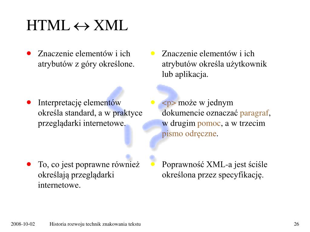 HTML XML • Znaczenie elementów i ich atrybutów z góry określone. • Znaczenie elementów i ich atrybutów określa użytkownik lub aplikacja. • Interpretację elementów określa standard, a w praktyce przeglądarki internetowe. • <p> może w jednym dokumencie oznaczać paragraf, w drugim pomoc, a w trzecim pismo odręczne. • To, co jest poprawne również określają przeglądarki internetowe. • Poprawność XML-a jest ściśle określona przez specyfikację. Historia rozwoju technik znakowania tekstu