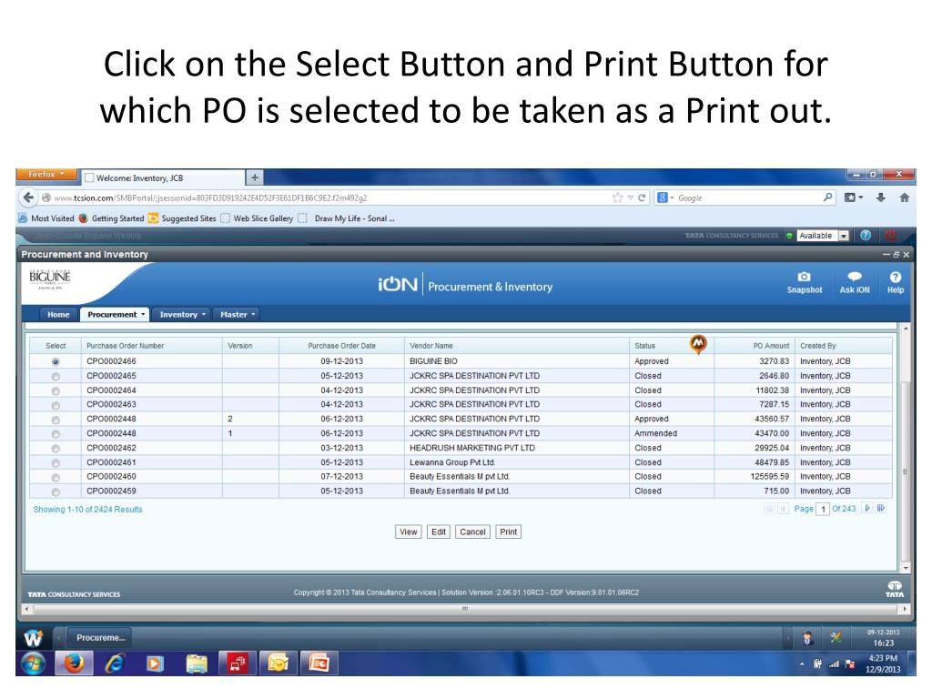 Click on the Select Button and Print Button for which PO is selected to be taken as a Print out.