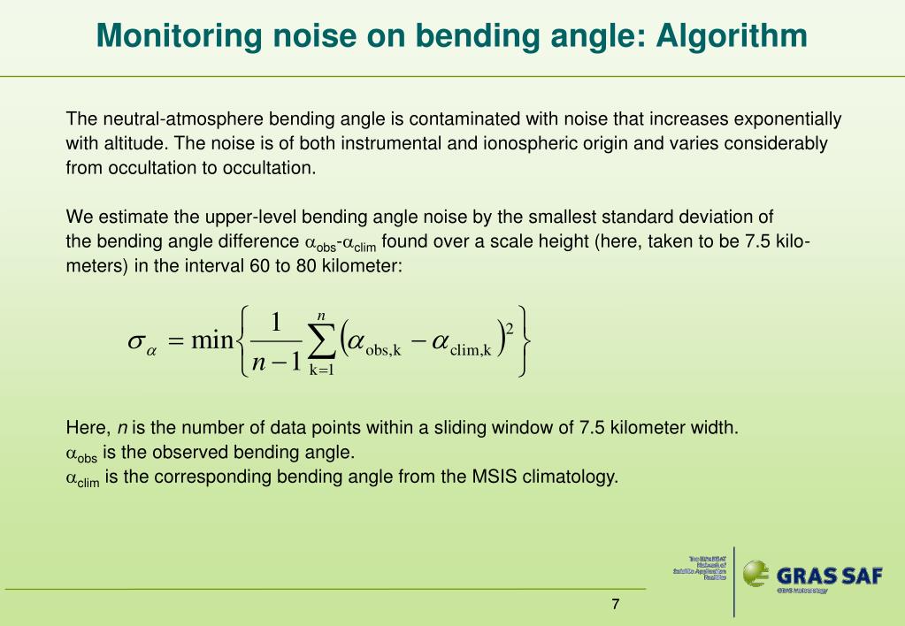 Monitoring noise on bending angle: Algorithm The neutral-atmosphere bending angle is contaminated with noise that increases exponentially with altitude. The noise is of both instrumental and ionospheric origin and varies considerably from occultation to occultation. We estimate the upper-level bending angle noise by the smallest standard deviation of the bending angle difference aobs-aclim found over a scale height (here, taken to be 7.5 kilo- meters) in the interval 60 to 80 kilometer: Here, n is the number of data points within a sliding window of 7.5 kilometer width. aobs is the observed bending angle. aclim is the corresponding bending angle from the MSIS climatology.