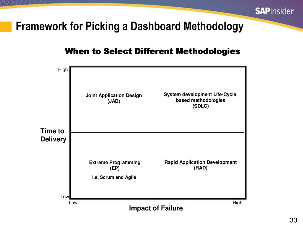The Gray Areas of Dashboard Methodologies • While presented as clearly delineated areas of selection, there are, in fact, several dimensions when multiple methodologies can be employed • I.e., when time to delivery is moderate or when the impact of failure is moderate The framework is intended to illustrate the differences among the appropriateness of each methodology This decision is clearer in the extreme. However, in reality there may be “gray zones” where more than one answer may be correct
