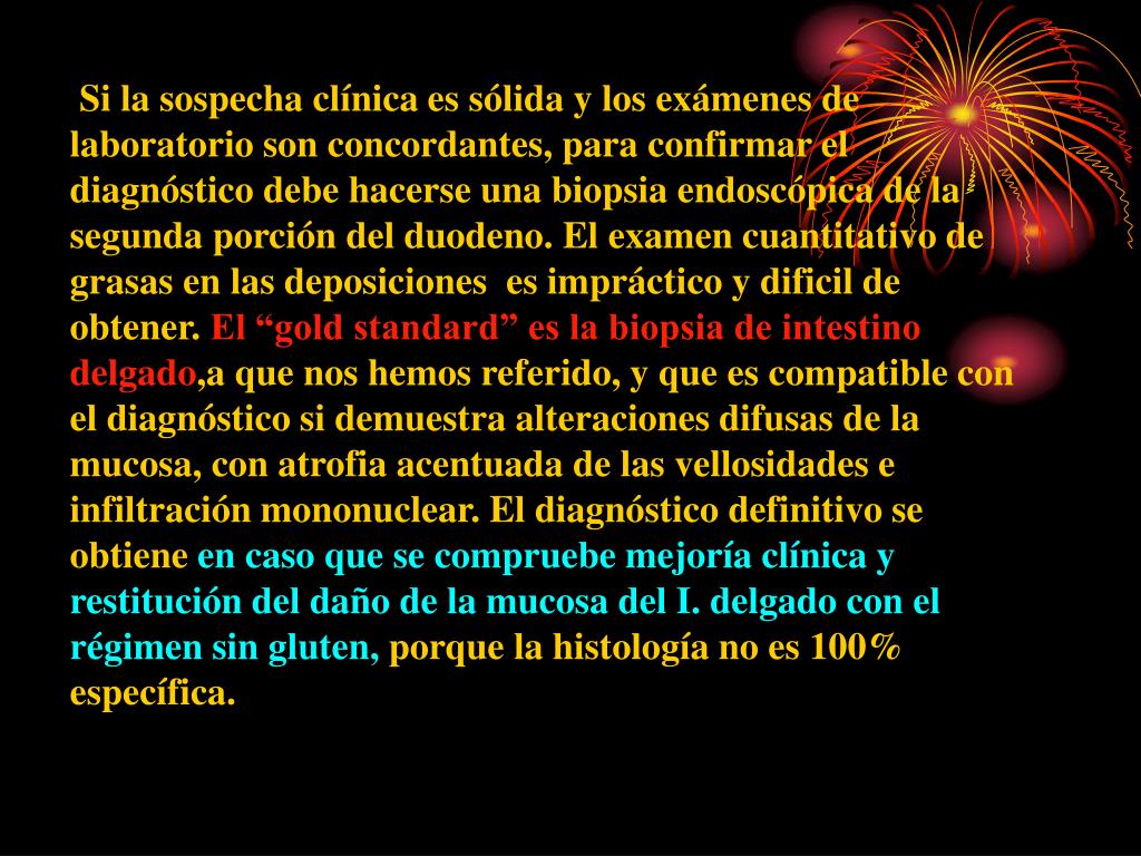 Si la sospecha clínica es sólida y los exámenes de laboratorio son concordantes, para confirmar el diagnóstico debe hacerse una biopsia endoscópica de la segunda porción del duodeno. El examen cuantitativo de grasas en las deposiciones es impráctico y dificil de obtener. El “gold standard” es la biopsia de intestino delgado,a que nos hemos referido, y que es compatible con el diagnóstico si demuestra alteraciones difusas de la mucosa, con atrofia acentuada de las vellosidades e infiltración mononuclear. El diagnóstico definitivo se obtiene en caso que se compruebe mejoría clínica y restitución del daño de la mucosa del I. delgado con el régimen sin gluten, porque la histología no es 100% específica.