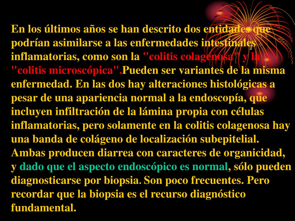 En los últimos años se han descrito dos entidades que podrían asimilarse a las enfermedades intestinales inflamatorias, como son la "colitis colagenosa"y la"colitis microscópica".Pueden ser variantes de la misma enfermedad. En las dos hay alteraciones histológicas a pesar de una apariencia normal a la endoscopía, que incluyen infiltración de la lámina propia con células inflamatorias, pero solamente en la colitis colagenosa hay una banda de colágeno de localización subepitelial. Ambas producen diarrea con caracteres de organicidad, y dado que el aspecto endoscópico es normal, sólo pueden diagnosticarse por biopsia.Son poco frecuentes. Pero recordar que la biopsia es el recurso diagnóstico fundamental.