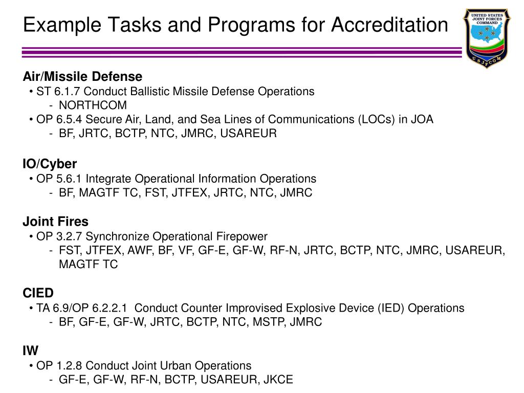 Example Tasks and Programs for Accreditation • Air/Missile Defense • ST 6.1.7 Conduct Ballistic Missile Defense Operations • NORTHCOM • OP 6.5.4 Secure Air, Land, and Sea Lines of Communications (LOCs) in JOA • BF, JRTC, BCTP, NTC, JMRC, USAREUR • IO/Cyber • OP 5.6.1 Integrate Operational Information Operations • BF, MAGTF TC, FST, JTFEX, JRTC, NTC, JMRC • Joint Fires • OP 3.2.7 Synchronize Operational Firepower • FST, JTFEX, AWF, BF, VF, GF-E, GF-W, RF-N, JRTC, BCTP, NTC, JMRC, USAREUR, MAGTF TC CIED • TA 6.9/OP 6.2.2.1 Conduct Counter Improvised Explosive Device (IED) Operations • BF, GF-E, GF-W, JRTC, BCTP, NTC, MSTP, JMRC IW • OP 1.2.8 Conduct Joint Urban Operations • GF-E, GF-W, RF-N, BCTP, USAREUR, JKCE