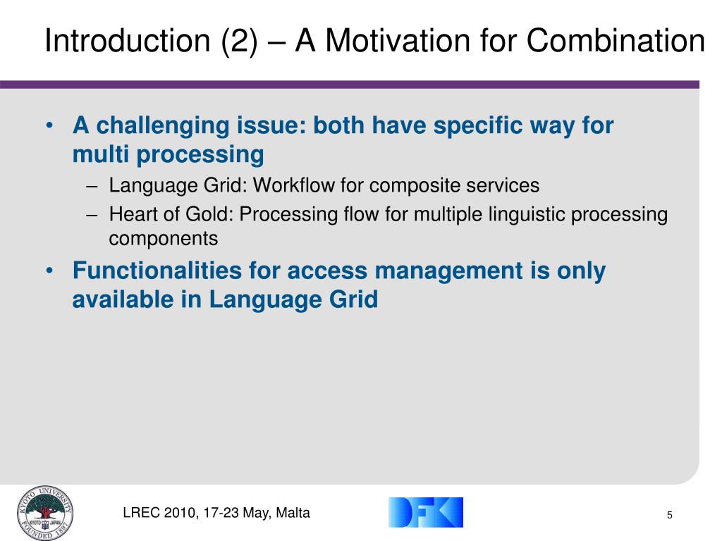 Introduction (2) – A Motivation for Combination • A challenging issue: both have specific way for multi processing • Language Grid: Workflow for composite services • Heart of Gold: Processing flow for multiple linguistic processing components • Functionalities for access management is only available in Language Grid