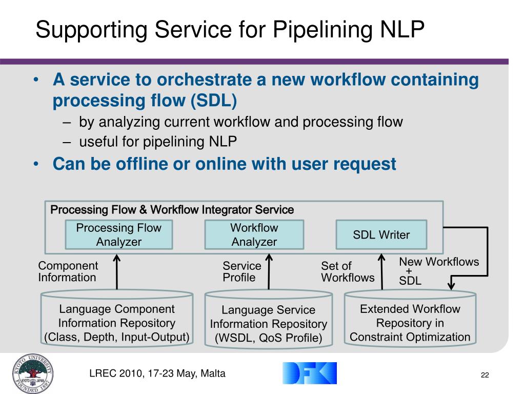 Supporting Service for Pipelining NLP • A service to orchestrate a new workflow containing processing flow (SDL) • by analyzing current workflow and processing flow • useful for pipelining NLP • Can be offline or online with user request Processing Flow & Workflow Integrator Service Processing Flow Analyzer Workflow Analyzer SDL Writer New Workflows + SDL Component Information Service Profile Set of Workflows Language Component Information Repository (Class, Depth, Input-Output) Language Service Information Repository (WSDL, QoS Profile) Extended Workflow Repository in Constraint Optimization