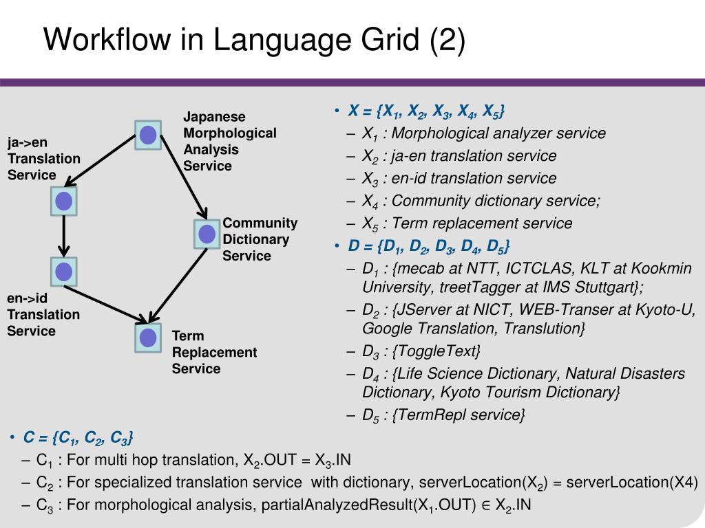 Workflow in Language Grid (2) • X = {X1, X2, X3, X4, X5} • X1 : Morphological analyzer service • X2 : ja-en translation service • X3 : en-id translation service • X4 : Community dictionary service; • X5 : Term replacement service • D = {D1, D2, D3, D4, D5} • D1 : {mecab at NTT, ICTCLAS, KLT at Kookmin University, treetTagger at IMS Stuttgart}; • D2 : {JServer at NICT, WEB-Transer at Kyoto-U, Google Translation, Translution} • D3 : {ToggleText} • D4 : {Life Science Dictionary, Natural Disasters Dictionary, Kyoto Tourism Dictionary} • D5 : {TermRepl service} Japanese Morphological Analysis Service ja->en Translation Service Community Dictionary Service en->id Translation Service Term Replacement Service • C = {C1, C2, C3} • C1 : For multi hop translation, X2.OUT = X3.IN • C2 : For specializedtranslation service with dictionary, serverLocation(X2) = serverLocation(X4) • C3 : For morphological analysis,partialAnalyzedResult(X1.OUT) ∈ X2.IN