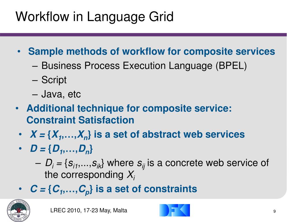 Workflow in Language Grid • Sample methods of workflow for composite services • Business Process Execution Language (BPEL) • Script • Java, etc • Additional technique for composite service: Constraint Satisfaction • X = {X1,…,Xn}is a set of abstract web services • D = {D1,…,Dn} • Di = {si1,...,sik}where sij is a concrete web service of the corresponding Xi • C = {C1,…,Cp}is a set of constraints
