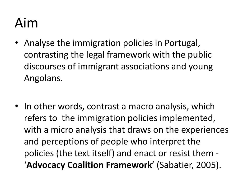 Aim • Analyse the immigration policies in Portugal, contrasting the legal framework with the public discourses of immigrant associations and young Angolans. • In other words, contrast a macro analysis, which refers to the immigration policies implemented, with a micro analysis that draws on the experiences and perceptions of people who interpret the policies (the text itself) and enact or resist them - ‘Advocacy Coalition Framework’ (Sabatier, 2005).