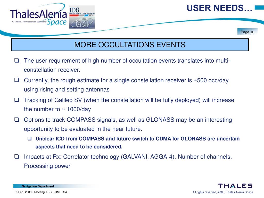 USER NEEDS… MORE OCCULTATIONS EVENTS • The user requirement of high number of occultation events translates into multi-constellation receiver. • Currently, the rough estimate for a single constellation receiver is ~500 occ/day using rising and setting antennas • Tracking of Galileo SV (when the constellation will be fully deployed) will increase the number to ~ 1000/day • Options to track COMPASS signals, as well as GLONASS may be an interesting opportunity to be evaluated in the near future. • Unclear ICD from COMPASS and future switch to CDMA for GLONASS are uncertain aspects that need to be considered. • Impacts at Rx: Correlator technology (GALVANI, AGGA-4), Number of channels, Processing power