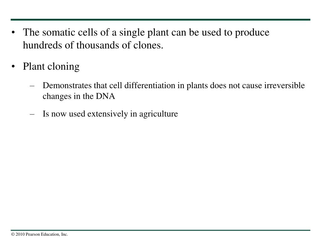 The somatic cells of a single plant can be used to produce hundreds of thousands of clones. • Plant cloning • Demonstrates that cell differentiation in plants does not cause irreversible changes in the DNA • Is now used extensively in agriculture