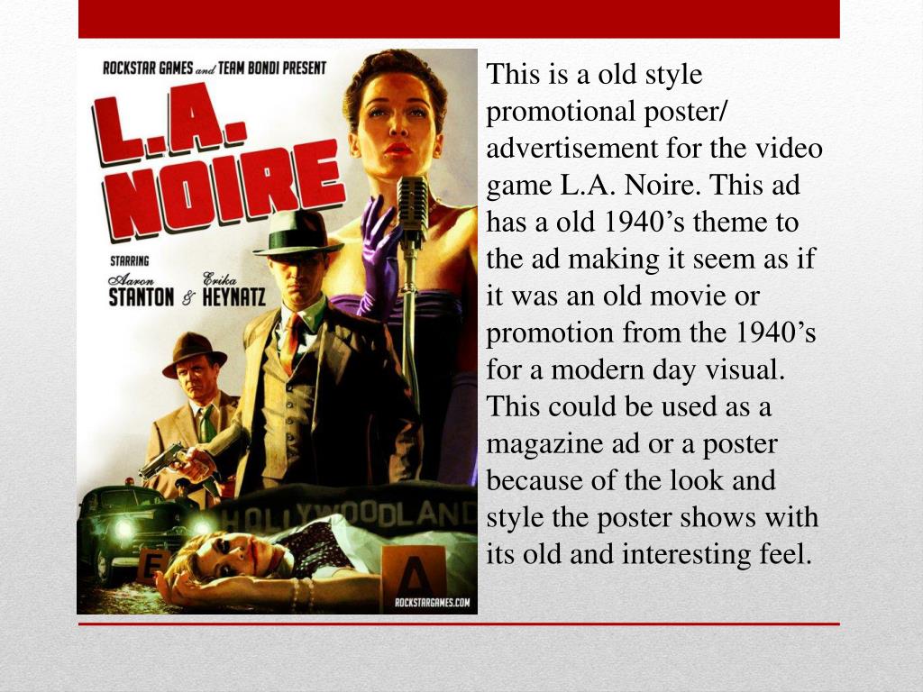 This is a old style promotional poster/ advertisement for the video game L.A. Noire. This ad has a old 1940’s theme to the ad making it seem as if it was an old movie or promotion from the 1940’s for a modern day visual. This could be used as a magazine ad or a poster because of the look and style the poster shows with its old and interesting feel.