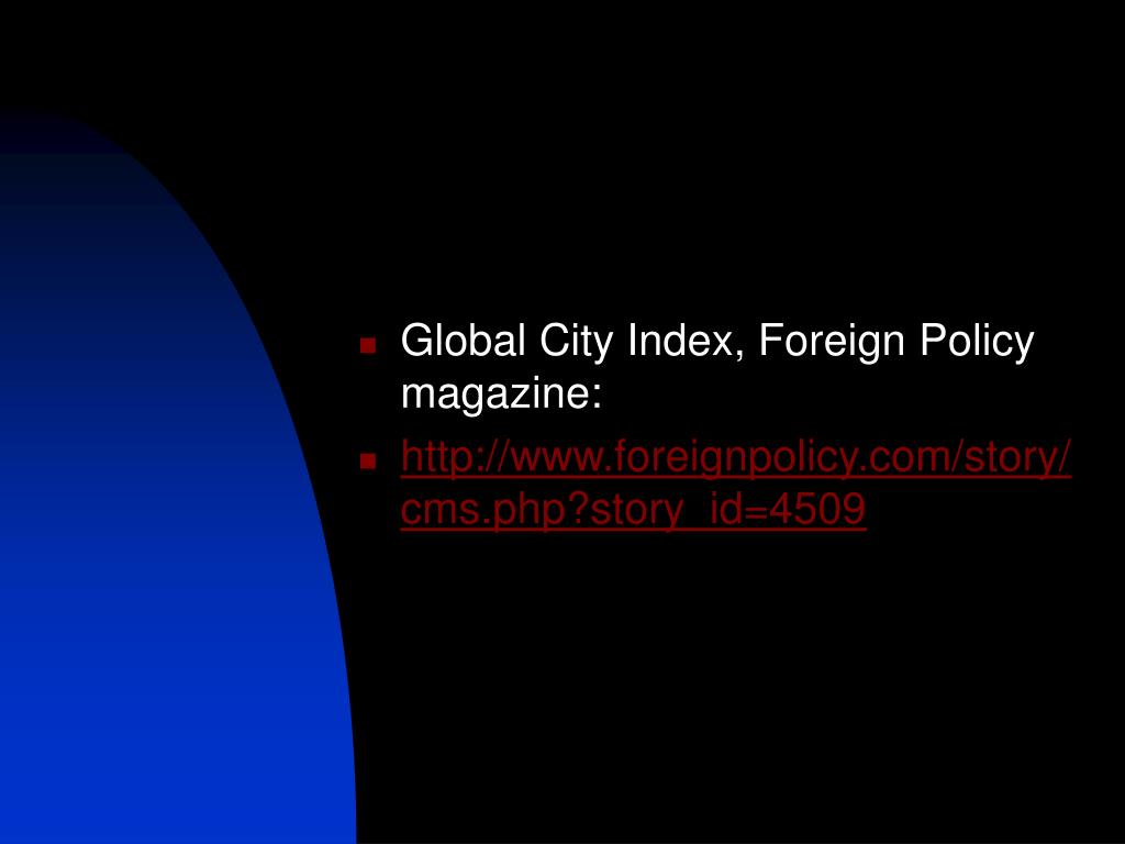 Global City Index, Foreign Policy magazine: • http://www.foreignpolicy.com/story/cms.php?story_id=4509