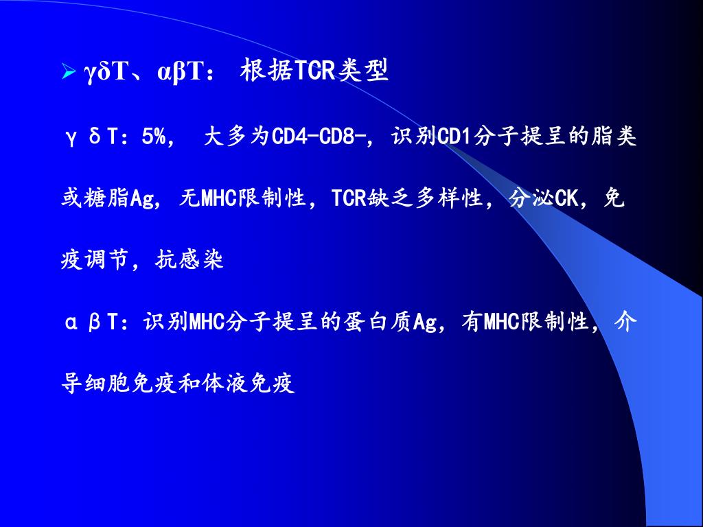 γδT、αβT: 根据TCR类型 γδT:5%, 大多为CD4-CD8-, 识别CD1分子提呈的脂类或糖脂Ag, 无MHC限制性,TCR缺乏多样性,分泌CK,免疫调节,抗感染 αβT:识别MHC分子提呈的蛋白质Ag,有MHC限制性,介导细胞免疫和体液免疫