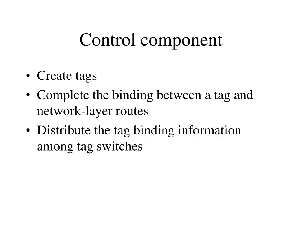 Cont. • Control component -- a set of software modules used to distribute and maintain the tag information inside a tagged network domain -- different module support different routing protocol