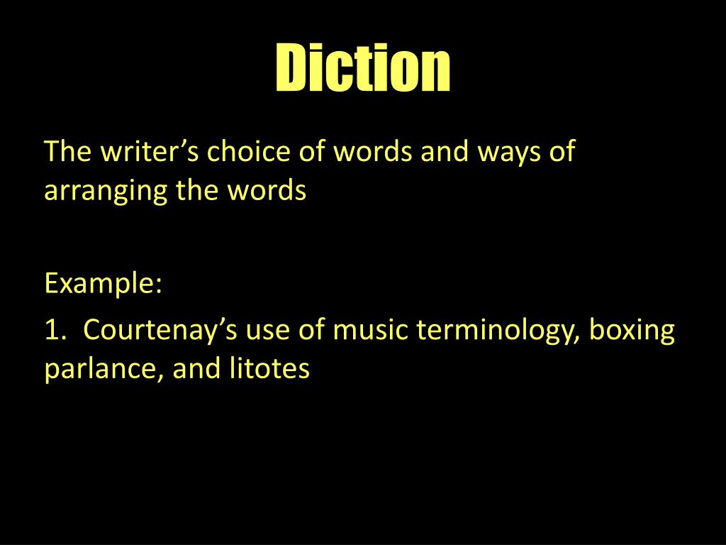 Diction The writer’s choice of words and ways of arranging the words Example: 1. Courtenay’s use of music terminology, boxing parlance, and litotes
