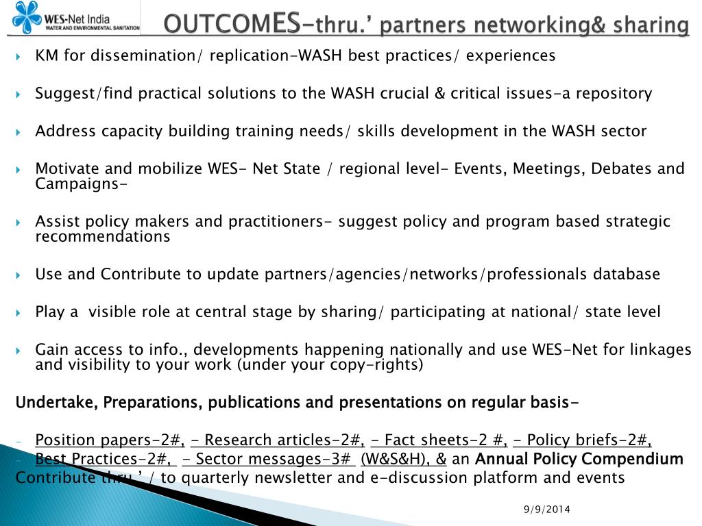 OUTCOMES-thru.’ partners networking& sharing • KM for dissemination/ replication-WASH best practices/ experiences • Suggest/find practical solutions to the WASH crucial & critical issues-a repository • Address capacity building training needs/ skills development in the WASH sector • Motivate and mobilize WES- Net State / regional level- Events, Meetings, Debates and Campaigns- • Assist policy makers and practitioners- suggest policy and program based strategic recommendations • Use and Contribute to update partners/agencies/networks/professionals database • Play a visible role at central stage by sharing/ participating at national/ state level • Gain access to info., developments happening nationally and use WES-Net for linkages and visibility to your work (under your copy-rights) Undertake, Preparations, publications and presentations on regular basis- • Position papers-2#,- Research articles-2#,- Fact sheets-2 #,- Policy briefs-2#, • Best Practices-2#, - Sector messages-3# (W&S&H), & an Annual Policy Compendium Contribute thru.’ / to quarterly newsletter and e-discussion platform and events