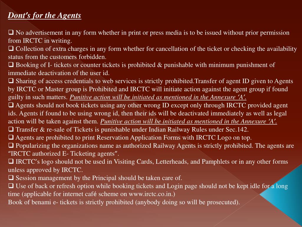 Dont’s for the Agents • No advertisement in any form whether in print or press media is to be issued without prior permission from IRCTC in writing. • Collection of extra charges in any form whether for cancellation of the ticket or checking the availability status from the customers forbidden. • Booking of I- tickets or counter tickets is prohibited & punishable with minimum punishment of immediate deactivation of the user id. • Sharing of access credentials to web services is strictly prohibited.Transfer of agent ID given to Agents by IRCTC or Master group is Prohibited and IRCTC will initiate action against the agent group if found guilty in such matters. Punitive action will be initiated as mentioned in the Annexure ‘A’. • Agents should not book tickets using any other wrong ID except only through IRCTC provided agent ids. Agents if found to be using wrong id, then their ids will be deactivated immediately as well as legal action will be taken against them. Punitive action will be initiated as mentioned in the Annexure ‘A’. • Transfer & re-sale of Tickets is punishable under Indian Railway Rules under Sec.142. • Agents are prohibited to print Reservation Application Forms with IRCTC Logo on top. • Popularizing the organizations name as authorized Railway Agents is strictly prohibited. The agents are “IRCTC authorized E- Ticketing agents”. • IRCTC’s logo should not be used in Visiting Cards, Letterheads, and Pamphlets or in any other forms unless approved by IRCTC. • Session management by the Principal should be taken care of. • Use of back or refresh option while booking tickets and Login page should not be kept idle for a long time (applicable for internet café scheme on www.irctc.co.in.) Book of benami e- tickets is strictly prohibited (anybody doing so will be prosecuted).