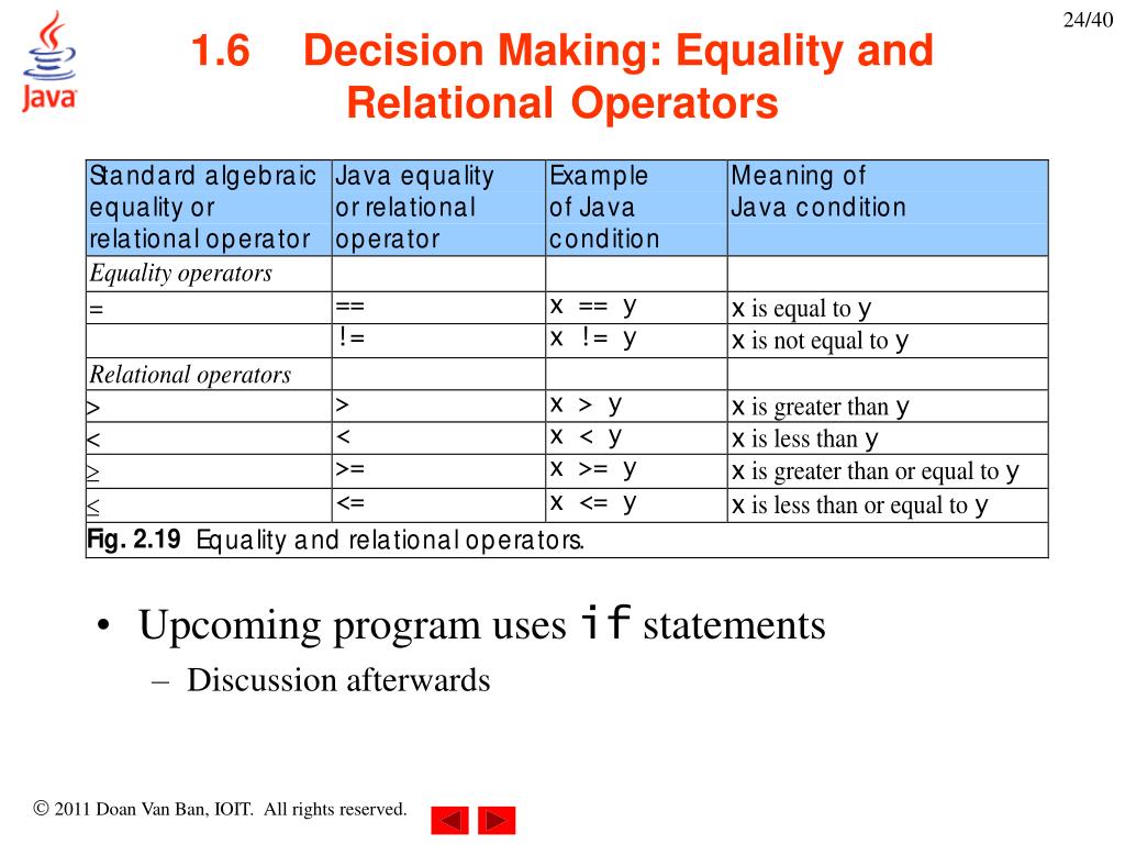 1.6 Decision Making: Equality and Relational Operators • Upcoming program uses if statements • Discussion afterwards