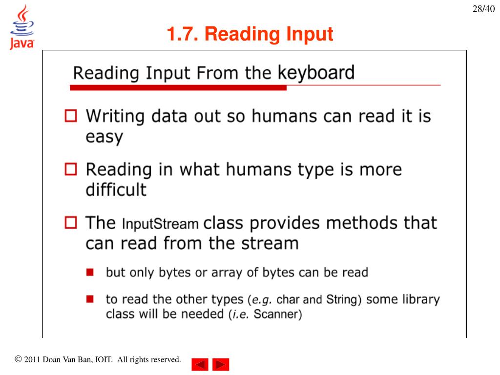 1.1 Introduction to Java • Java • Object oriented • Similar to C/C++ , so Friendly • Simple and more security (no pointers, no multiple inheritance) • Dynamic Web • Platform independent • Standard • In Java there are three kinds of applications • Standalone Application (Application) • Applets (mini application) • Application and Applets