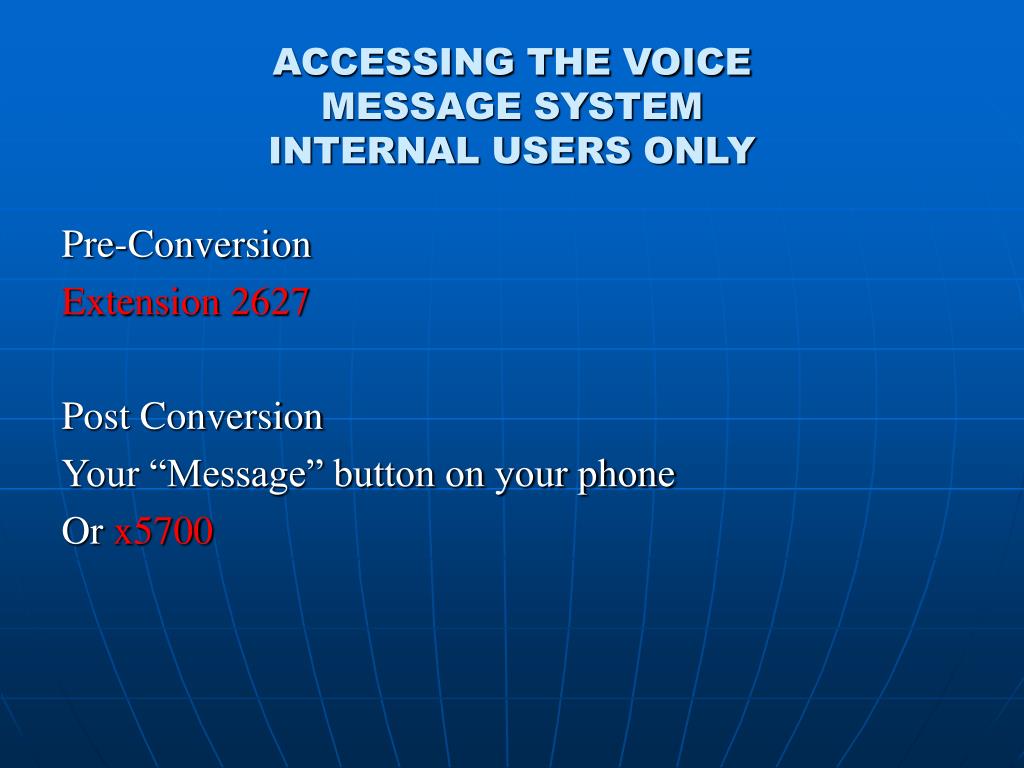 ACCESSING THE VOICE MESSAGE SYSTEMINTERNAL USERS ONLY Pre-Conversion Extension 2627 Post Conversion Your “Message” button on your phone Or x5700