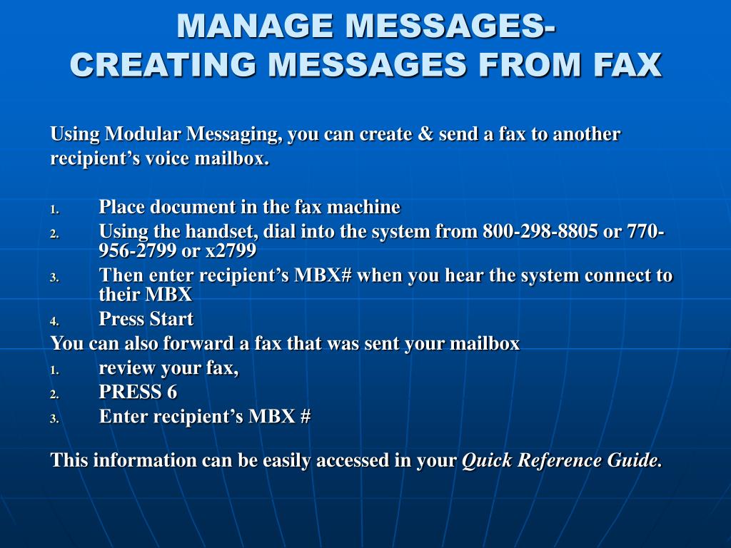 MANAGE MESSAGES-CREATING MESSAGES FROM FAX Using Modular Messaging, you can create & send a fax to another recipient’s voice mailbox. • Place document in the fax machine • Using the handset, dial into the system from 800-298-8805 or 770-956-2799 or x2799 • Then enter recipient’s MBX# when you hear the system connect to their MBX • Press Start You can also forward a fax that was sent your mailbox • review your fax, • PRESS 6 • Enter recipient’s MBX # This information can be easily accessed in your Quick Reference Guide.