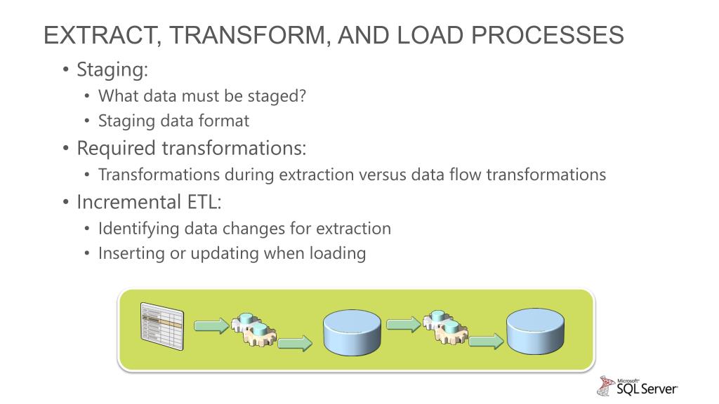 Extract, Transform, and Load Processes • Staging: • What data must be staged? • Staging data format • Required transformations: • Transformations during extraction versus data flow transformations • Incremental ETL: • Identifying data changes for extraction • Inserting or updating when loading
