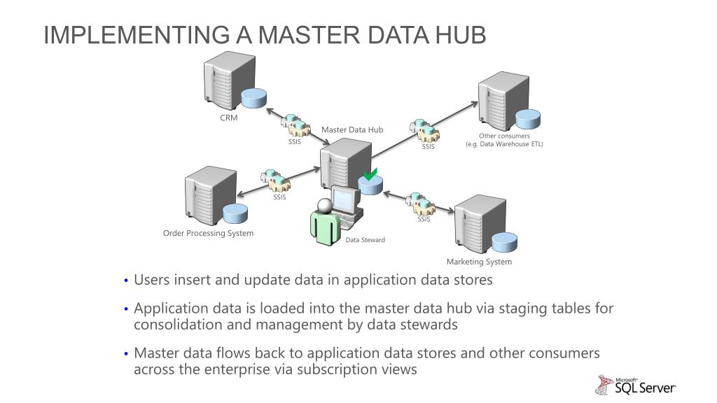 Implementing a Master Data Hub Master Data Hub Other consumers (e.g. Data Warehouse ETL) SSIS SSIS Order Processing System Marketing System CRM SSIS SSIS Data Steward • Users insert and update data in application data stores • Application data is loaded into the master data hub via staging tables for consolidation and management by data stewards • Master data flows back to application data stores and other consumers across the enterprise via subscription views
