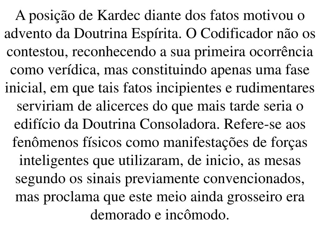 A posição de Kardec diante dos fatos motivou o advento da Doutrina Espírita. O Codificador não os contestou, reconhecendo a sua primeira ocorrência como verídica, mas constituindo apenas uma fase inicial, em que tais fatos incipientes e rudimentares serviriam de alicerces do que mais tarde seria o edifício da Doutrina Consoladora. Refere-se aos fenômenos físicos como manifestações de forças inteligentes que utilizaram, de inicio, as mesas segundo os sinais previamente convencionados, mas proclama que este meio ainda grosseiro era demorado e incômodo.