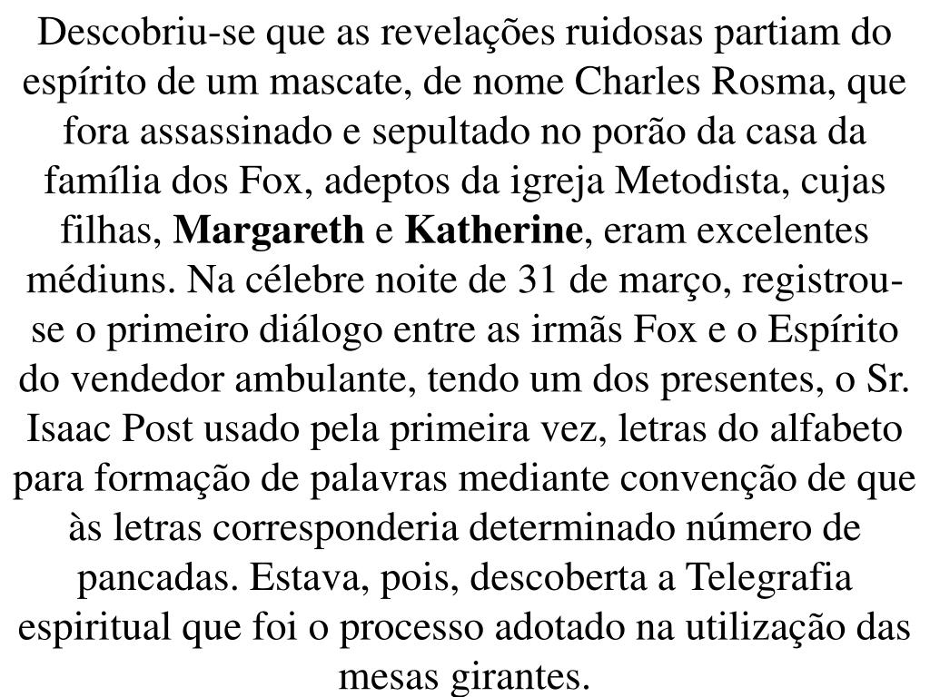 Descobriu-se que as revelações ruidosas partiam do espírito de um mascate, de nome Charles Rosma, que fora assassinado e sepultado no porão da casa da família dos Fox, adeptos da igreja Metodista, cujas filhas, Margareth e Katherine, eram excelentes médiuns. Na célebre noite de 31 de março, registrou-se o primeiro diálogo entre as irmãs Fox e o Espírito do vendedor ambulante, tendo um dos presentes, o Sr. Isaac Post usado pela primeira vez, letras do alfabeto para formação de palavras mediante convenção de que às letras corresponderia determinado número de pancadas. Estava, pois, descoberta a Telegrafia espiritual que foi o processo adotado na utilização das mesas girantes.