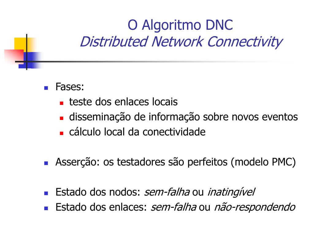 O Algoritmo DNCDistributed Network Connectivity • Fases: • teste dos enlaces locais • disseminação de informação sobre novos eventos • cálculo local da conectividade • Asserção: os testadores são perfeitos (modelo PMC) • Estado dos nodos: sem-falha ou inatingível • Estado dos enlaces: sem-falha ou não-respondendo