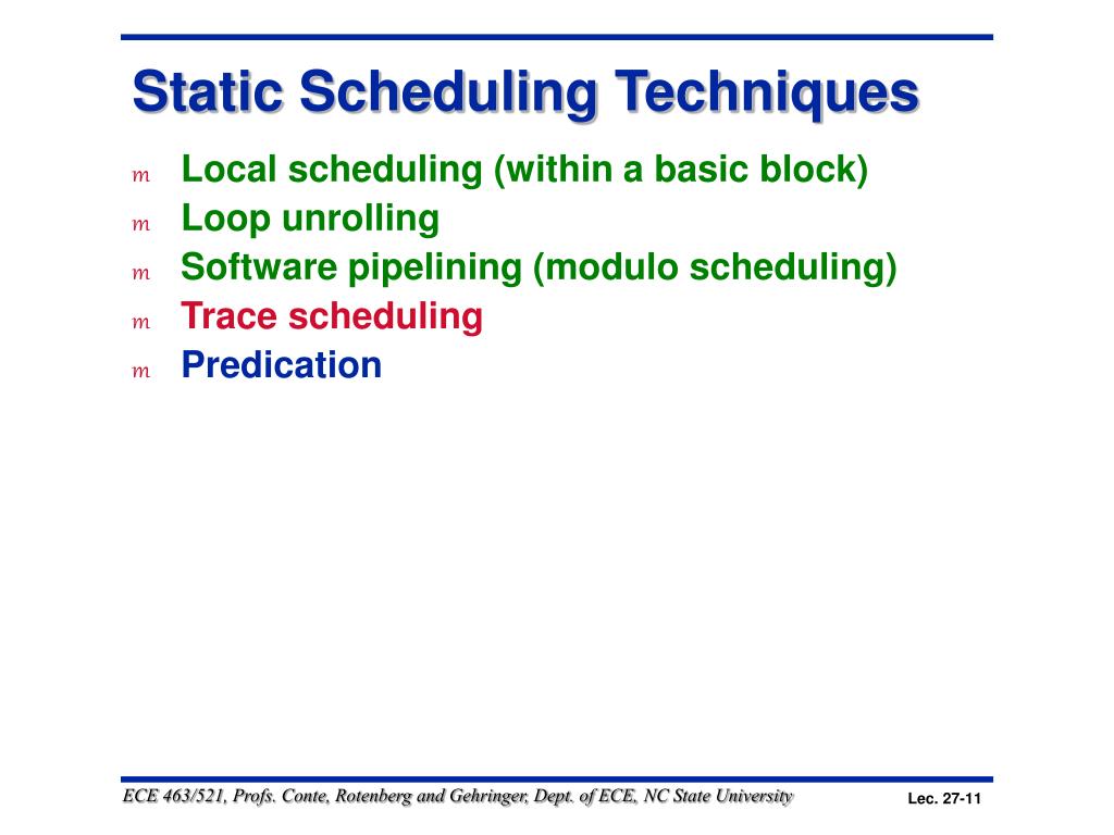 Static Scheduling Techniques • Local scheduling (within a basic block) • Loop unrolling • Software pipelining (modulo scheduling) • Trace scheduling • Predication ECE 463/521, Profs. Conte, Rotenberg and Gehringer, Dept. of ECE,NC State University