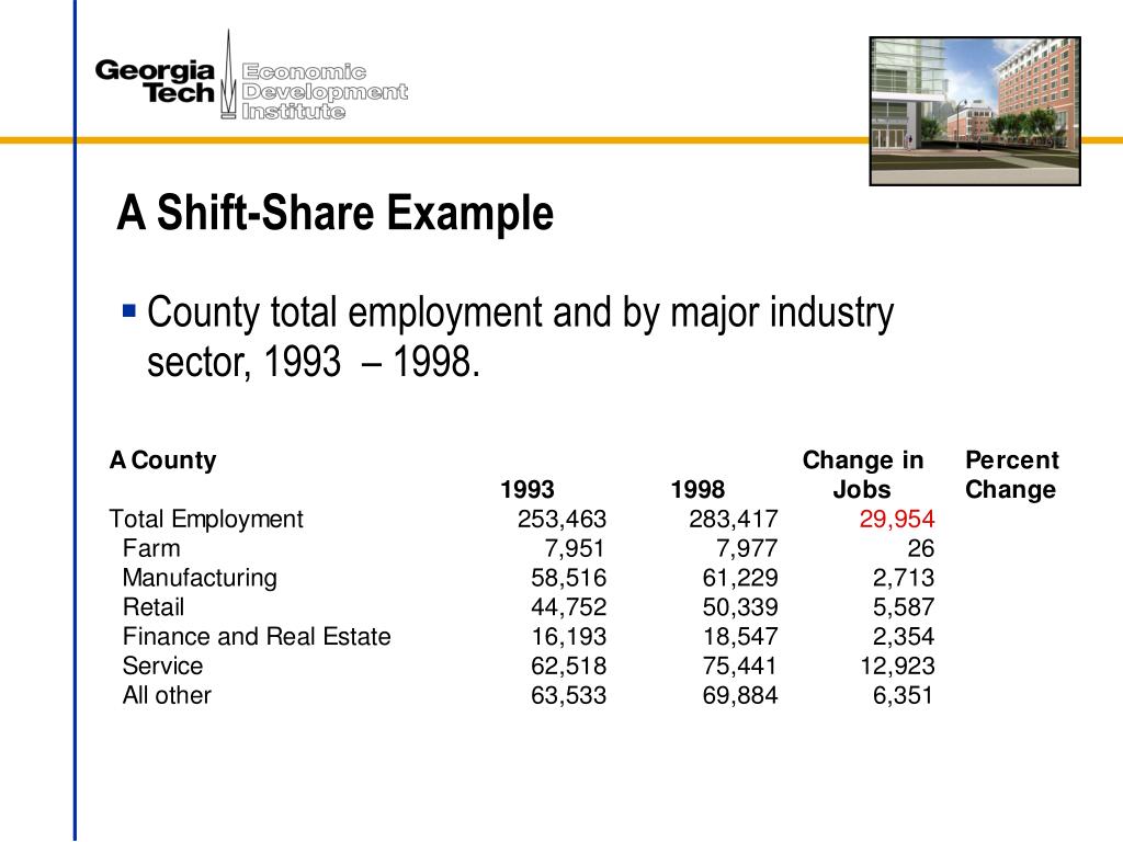 A Shift-Share Example • Compare a county to the U.S. economy. • We’ll use 1993 and 1998 with total employment divided into six sectors. • Rule of thumb is to use two time periods 5 or fewer years apart. • Analysis can be quite different for different time periods.