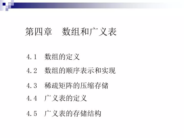 第四章 数组和广义表 4.1 数组的定义 4.2 数组的顺序表示和实现 4.3 稀疏矩阵的压缩存储 4.4 广义表的定义 4.5 广义表的存储结构