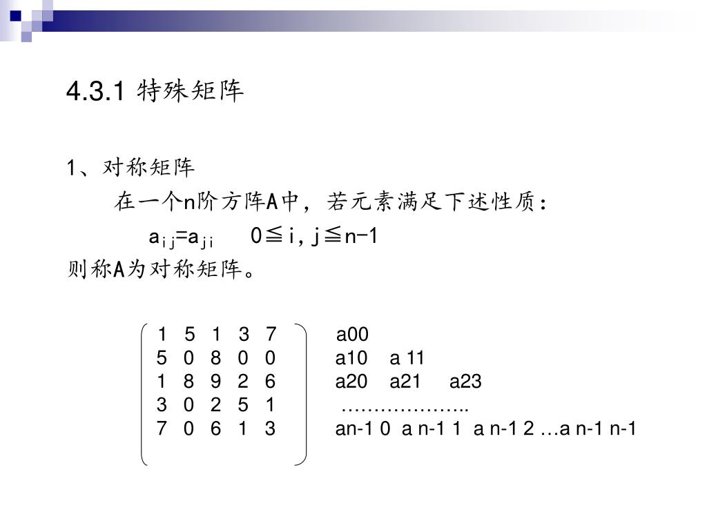 4.3.1 特殊矩阵 1、对称矩阵 在一个n阶方阵A中,若元素满足下述性质: aij=aji 0≦i,j≦n-1 则称A为对称矩阵。 1 5 1 3 7 a00 5 0 8 0 0 a10 a 11 1 8 9 2 6 a20 a21 a23 3 0 2 5 1 ……………….. 7 0 6 1 3 an-1 0 a n-1 1 a n-1 2 …a n-1 n-1
