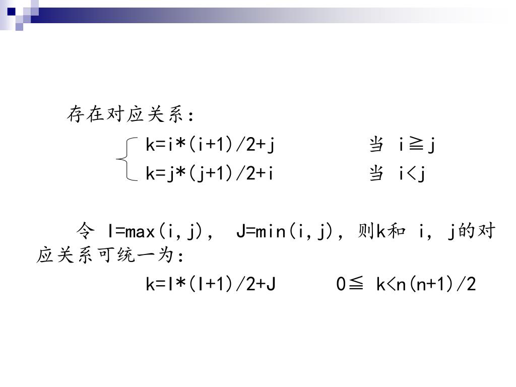 存在对应关系: k=i*(i+1)/2+j 当 i≧j k=j*(j+1)/2+i 当 i<j 令 I=max(i,j), J=min(i,j),则k和 i, j的对应关系可统一为: k=I*(I+1)/2+J 0≦ k<n(n+1)/2