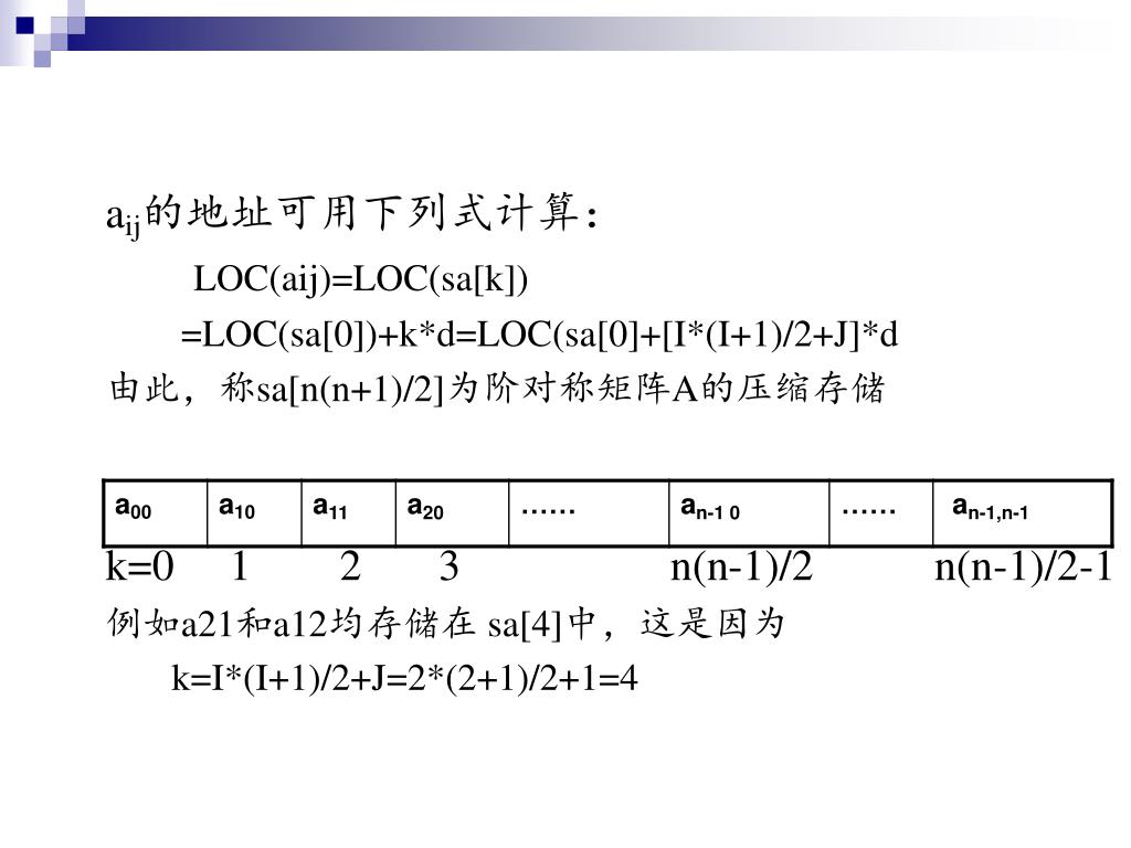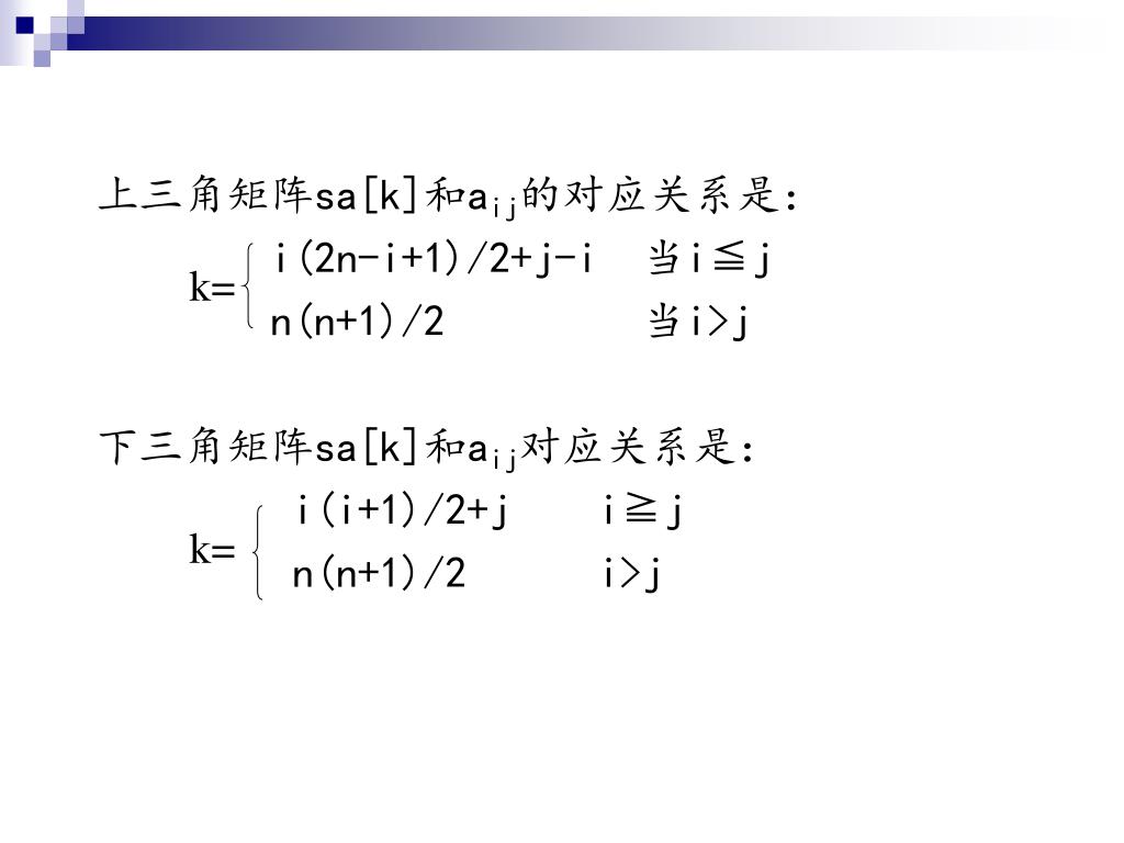 上三角矩阵sa[k]和aij的对应关系是: i(2n-i+1)/2+j-i 当i≦j n(n+1)/2 当i>j 下三角矩阵sa[k]和aij对应关系是: i(i+1)/2+j i≧j n(n+1)/2 i>j k= k=