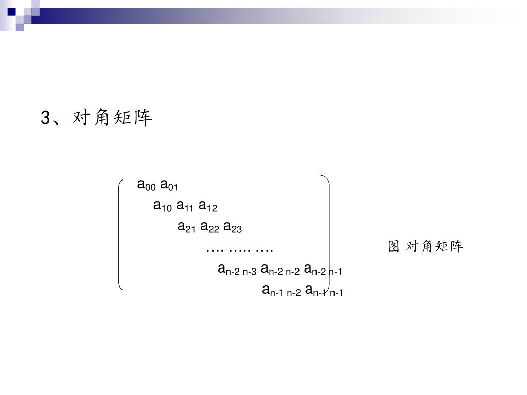 3、对角矩阵 a00 a01 a10 a11 a12 a21 a22 a23 …. ….. …. 图 对角矩阵 an-2 n-3 an-2 n-2 an-2 n-1 an-1 n-2 an-1 n-1