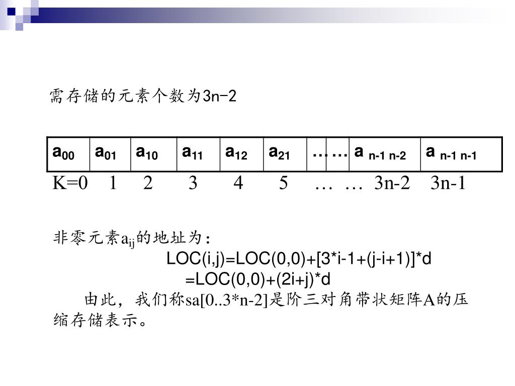 需存储的元素个数为3n-2 K=0 1 2 3 4 5 … … 3n-2 3n-1 非零元素aij的地址为: LOC(i,j)=LOC(0,0)+[3*i-1+(j-i+1)]*d =LOC(0,0)+(2i+j)*d 由此,我们称sa[0..3*n-2]是阶三对角带状矩阵A的压缩存储表示。