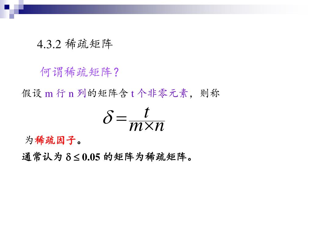 4.3.2 稀疏矩阵 何谓稀疏矩阵? 假设 m 行 n 列的矩阵含 t 个非零元素,则称 为稀疏因子。 通常认为 0.05 的矩阵为稀疏矩阵。