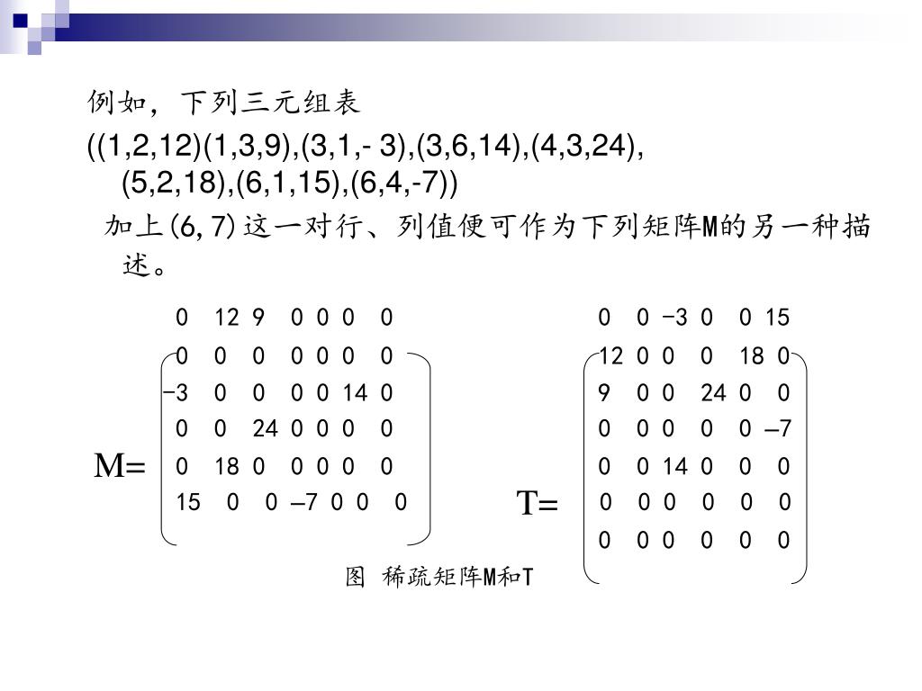例如,下列三元组表 ((1,2,12)(1,3,9),(3,1,- 3),(3,6,14),(4,3,24), (5,2,18),(6,1,15),(6,4,-7)) 加上(6,7)这一对行、列值便可作为下列矩阵M的另一种描述。 0 12 9 0 0 0 0 0 0 -3 0 0 15 0 0 0 0 0 0 0 12 0 0 0 18 0 -3 0 0 0 0 14 0 9 0 0 24 0 0 0 0 24 0 0 0 0 0 0 0 0 0 –7 0 18 0 0 0 0 0 0 0 14 0 0 0 15 0 0 –7 0 0 0 0 0 0 0 0 0 0 0 0 0 0 0 图 稀疏矩阵M和T M= T=