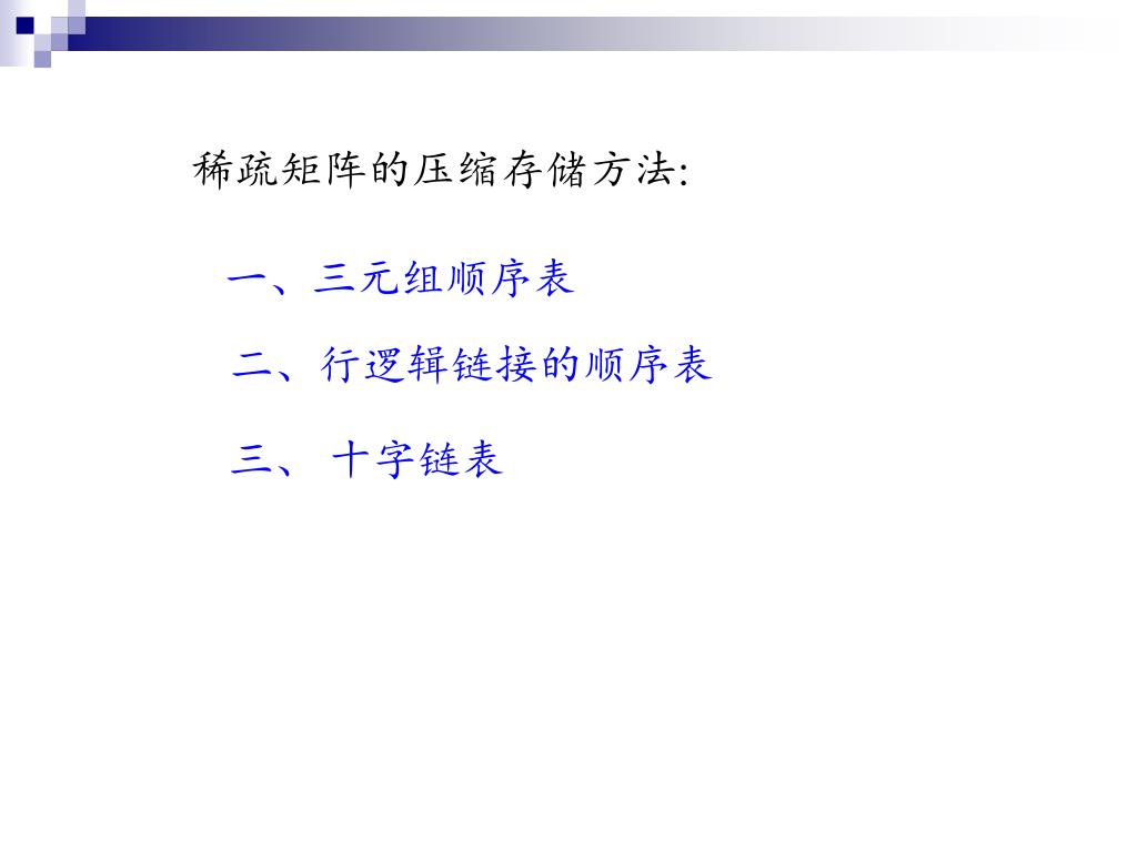 稀疏矩阵的压缩存储方法: 一、三元组顺序表 二、行逻辑链接的顺序表 三、 十字链表