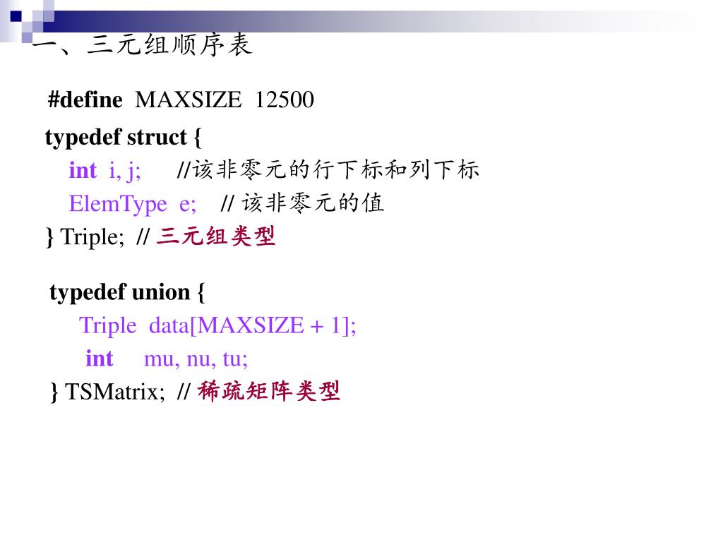 一、三元组顺序表 #define MAXSIZE 12500 typedef struct { int i, j; //该非零元的行下标和列下标 ElemType e; // 该非零元的值 } Triple; // 三元组类型 typedef union { Triple data[MAXSIZE + 1]; int mu, nu, tu; } TSMatrix; // 稀疏矩阵类型