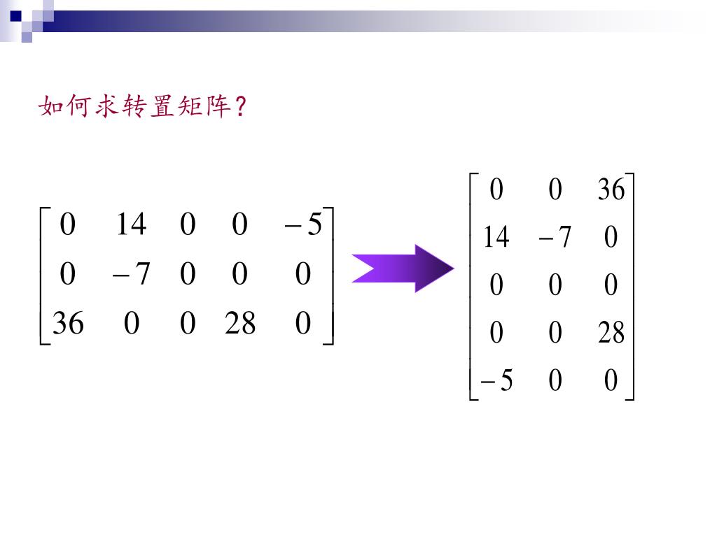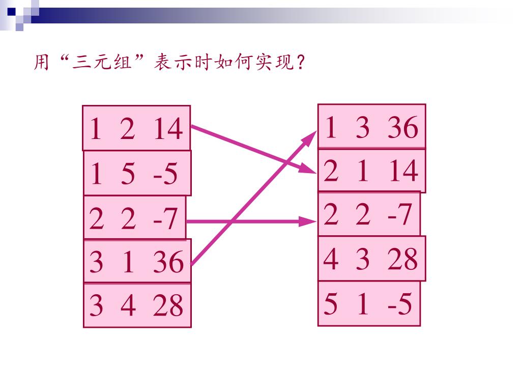 用“三元组”表示时如何实现? 1 3 36 1 2 14 2 1 14 1 5 -5 2 2 -7 2 2 -7 4 3 28 3 1 36 5 1 -5 3 4 28