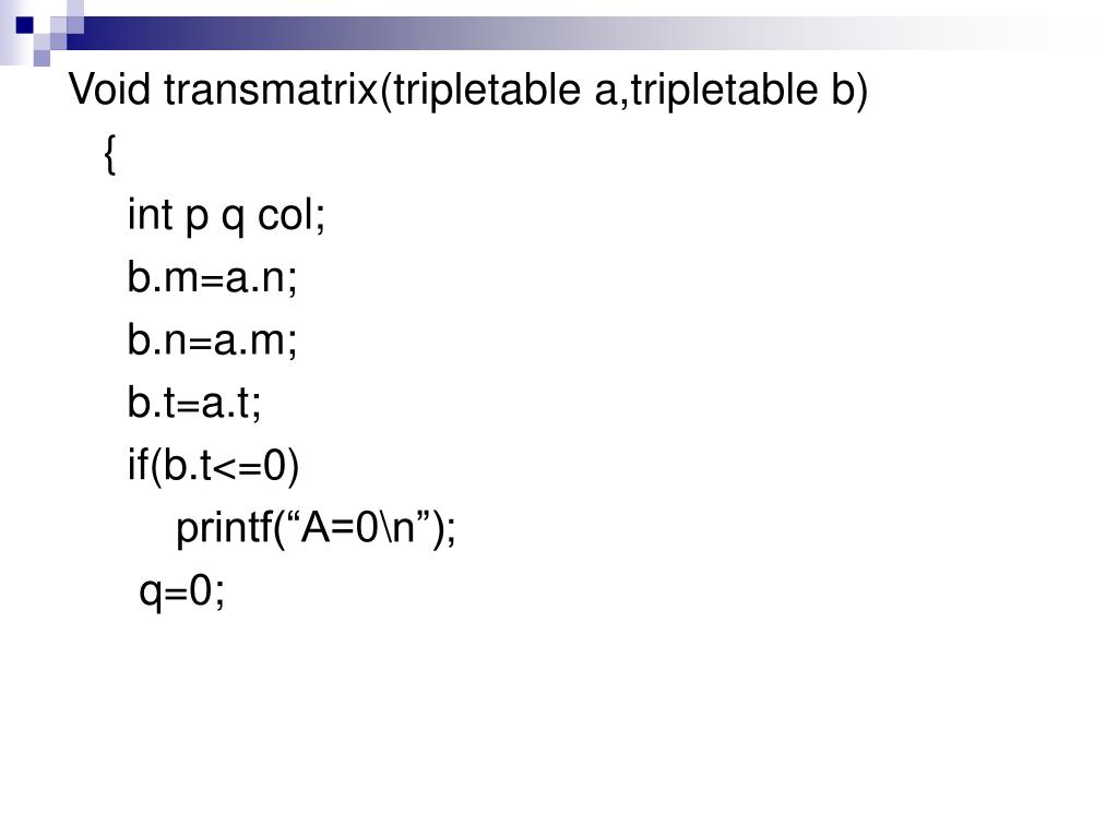 Void transmatrix(tripletable a,tripletable b) { int p q col; b.m=a.n; b.n=a.m; b.t=a.t; if(b.t<=0) printf(“A=0\n”); q=0;