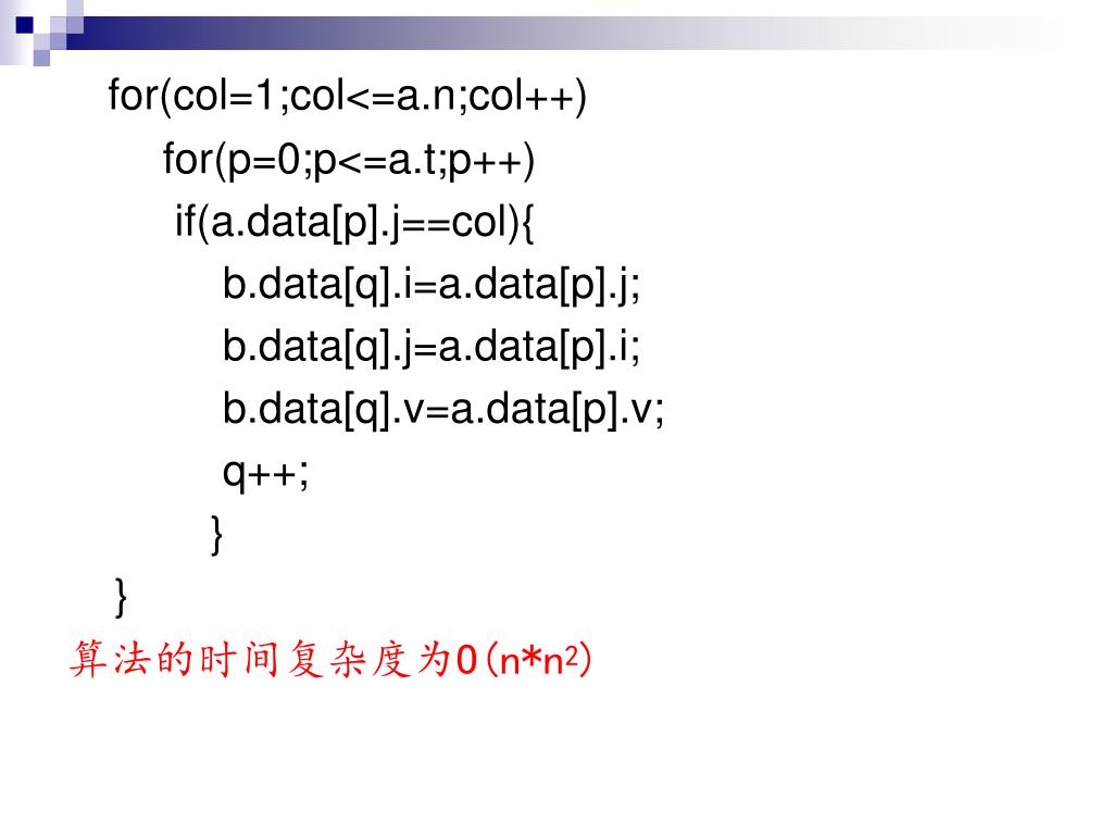 for(col=1;col<=a.n;col++) for(p=0;p<=a.t;p++) if(a.data[p].j==col){ b.data[q].i=a.data[p].j; b.data[q].j=a.data[p].i; b.data[q].v=a.data[p].v; q++; } } 算法的时间复杂度为O(n*n2)