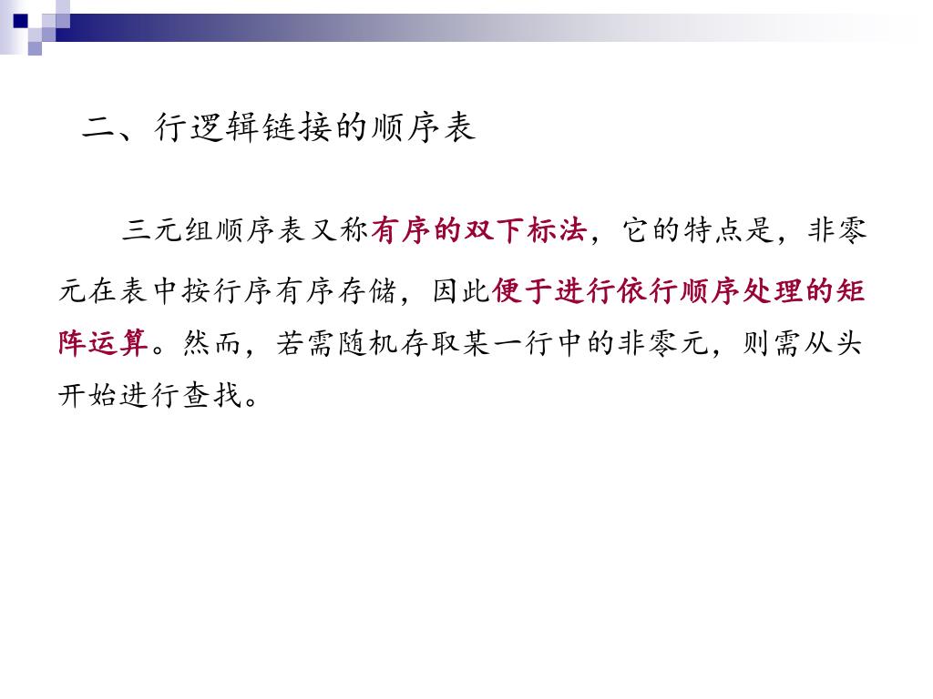 二、行逻辑链接的顺序表 三元组顺序表又称有序的双下标法,它的特点是,非零元在表中按行序有序存储,因此便于进行依行顺序处理的矩阵运算。然而,若需随机存取某一行中的非零元,则需从头开始进行查找。