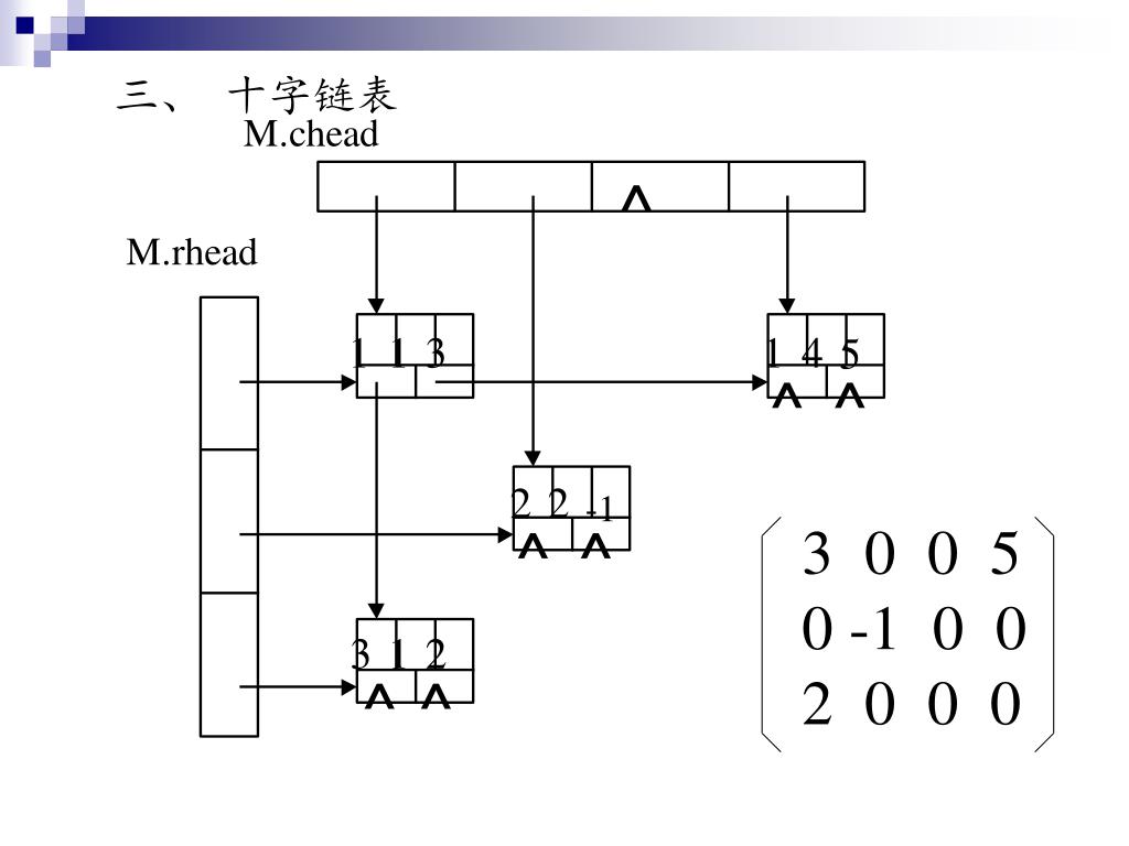 三、 十字链表 ^ 1 1 3 1 4 5 ^ ^ 2 2 -1 ^ ^ 3 0 0 5 0 -1 0 0 2 0 0 0 3 1 2 ^ ^