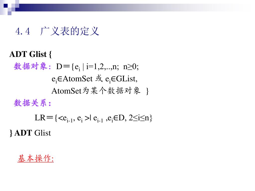 4.4 广义表的定义 ADT Glist { 数据对象:D={ei | i=1,2,..,n; n≥0; ei∈AtomSet 或 ei∈GList, AtomSet为某个数据对象 } 数据关系: LR={<ei-1, ei >| ei-1 ,ei∈D, 2≤i≤n} } ADT Glist 基本操作: