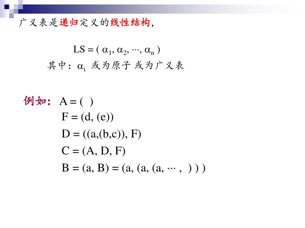 广义表是递归定义的线性结构, LS = ( 1, 2, , n ) 其中:i或为原子 或为广义表 例如: A = ( ) F = (d, (e)) D = ((a,(b,c)), F) C = (A, D, F) B = (a, B) = (a, (a, (a, , ) ) )