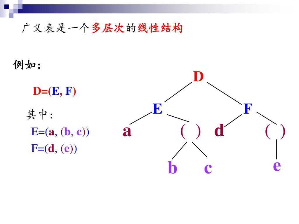 广义表是一个多层次的线性结构 例如: D D=(E, F) E F 其中: E=(a,(b,c)) F=(d, (e)) a ( ) d ( ) e b c
